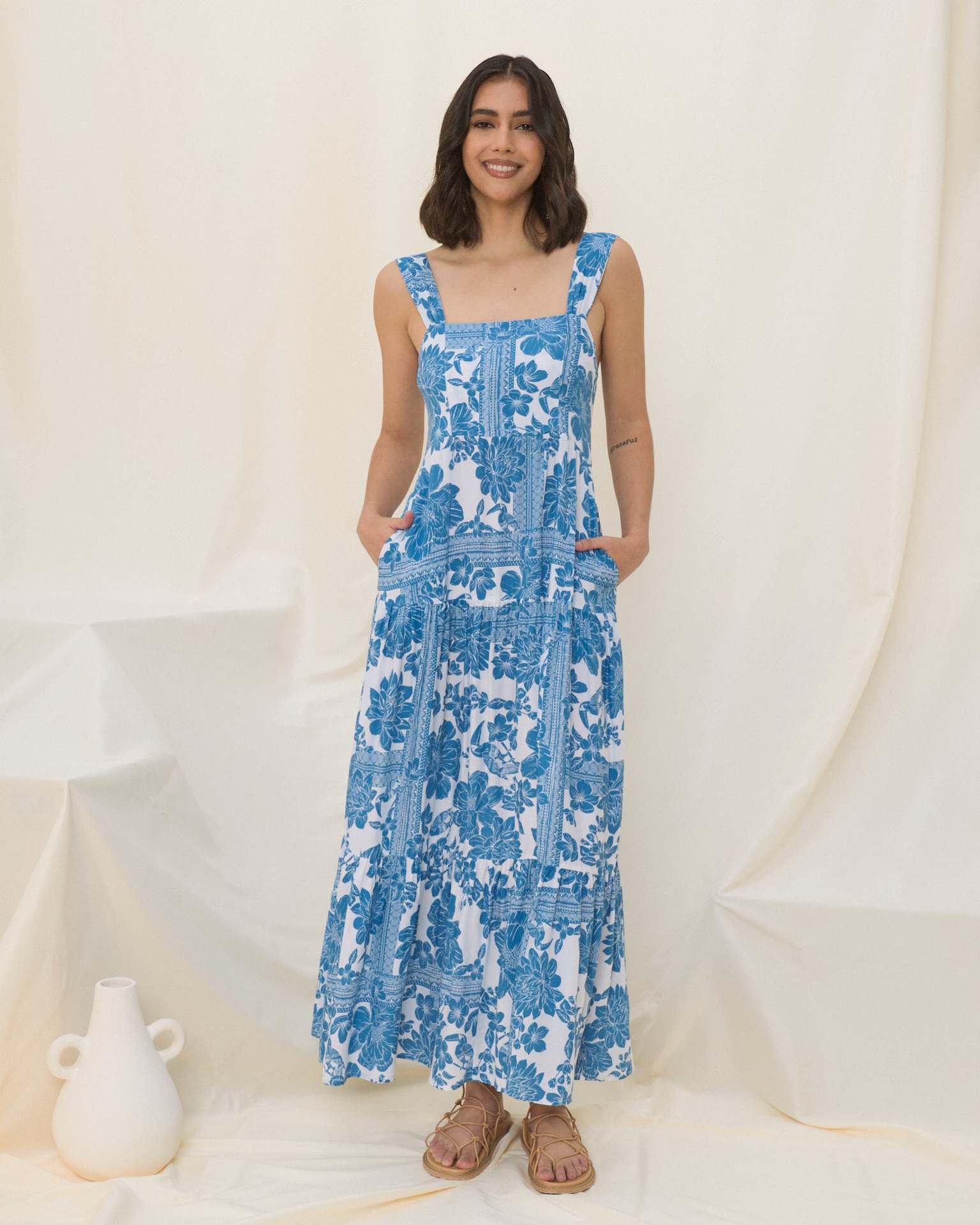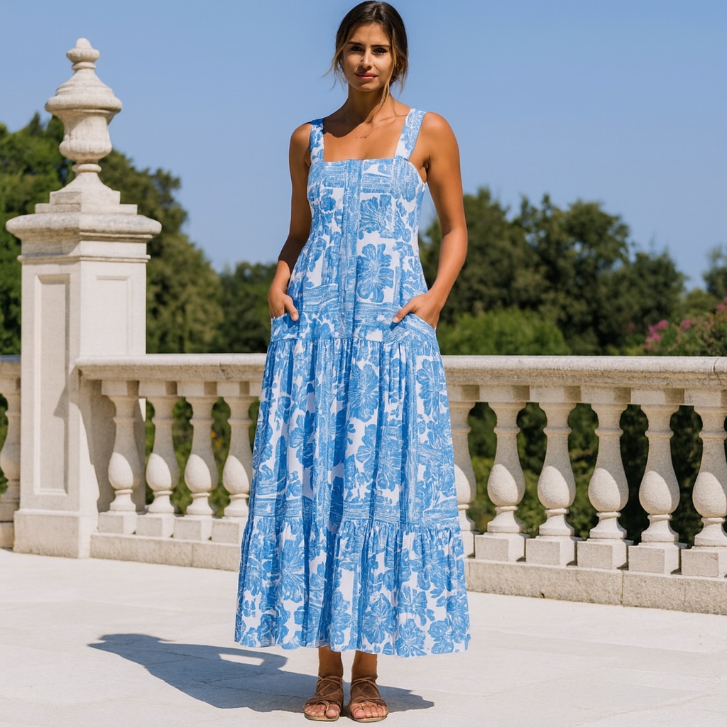 Blue White Floral Wide-Strap Maxi Dress – Summer Resort Style