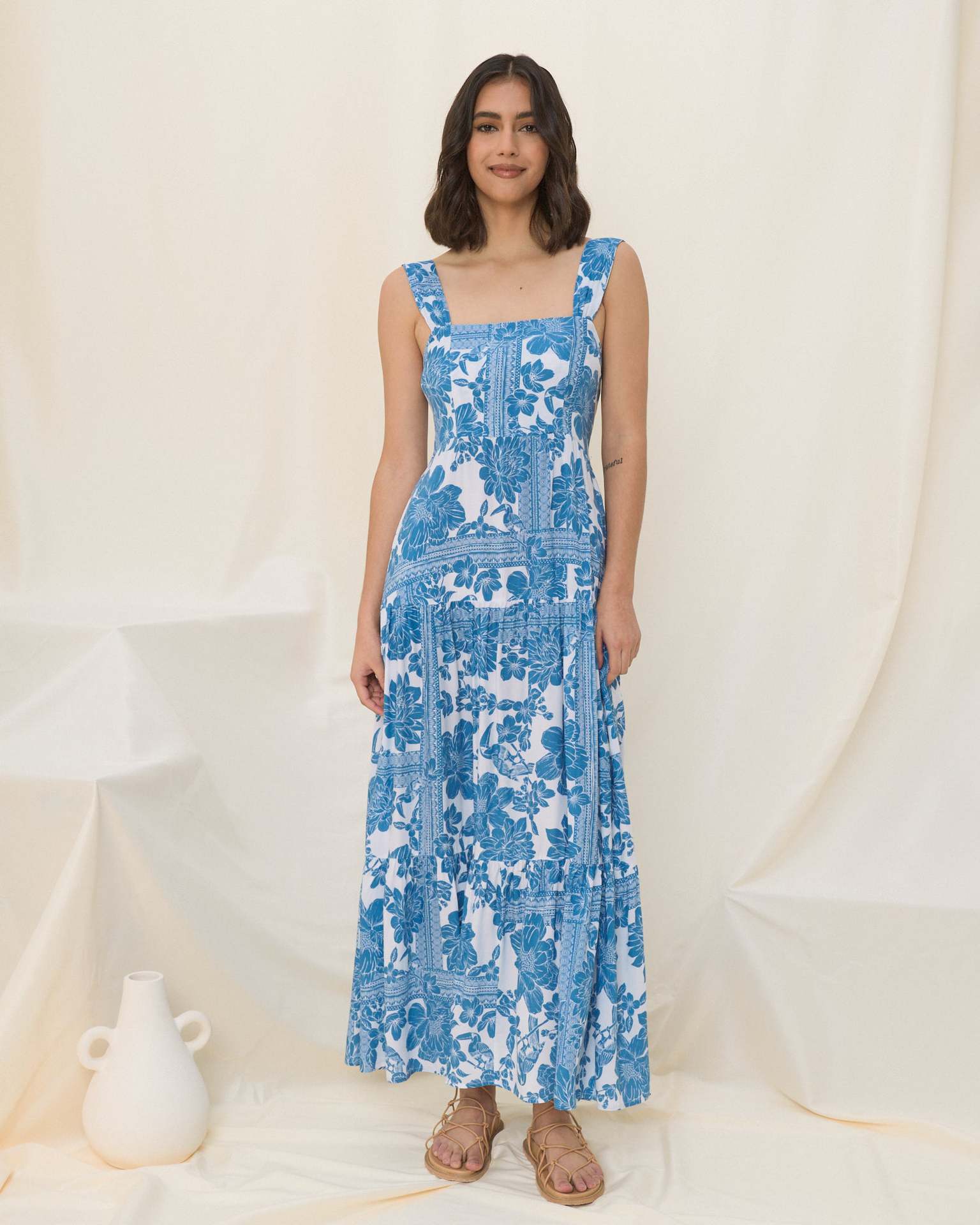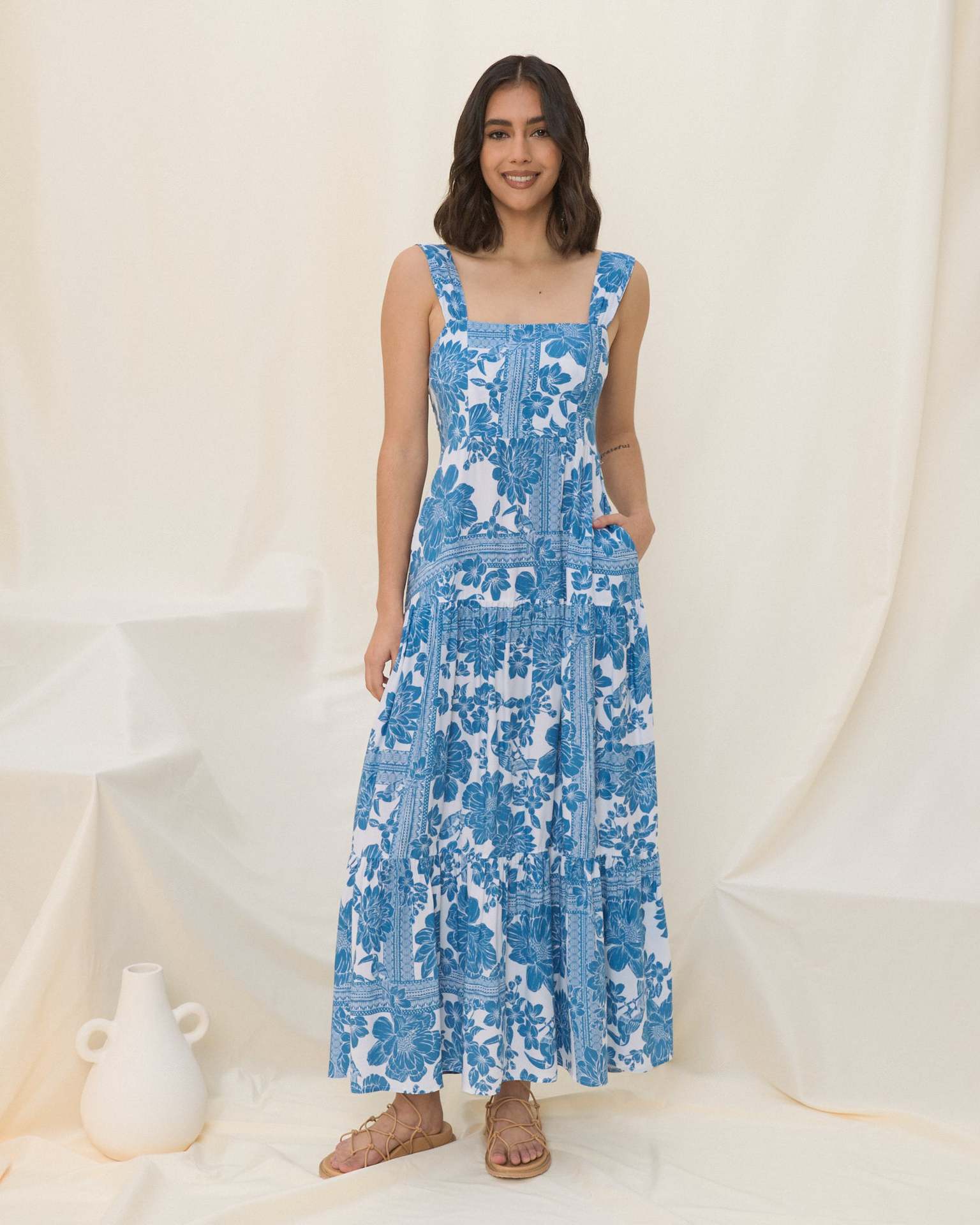 This blue floral maxi dress features a refreshing summer design with wide straps, a flowy silhouette, and lightweight breathable fabric. It blends elegance and comfort, making it the perfect warm-weather essential.