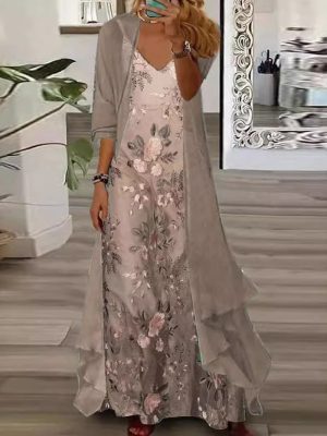 This embroidered two-piece maxi dress features a floral slip dress paired with a lightweight long cardigan, creating an elegant layered look perfect for special occasions and refined everyday style.