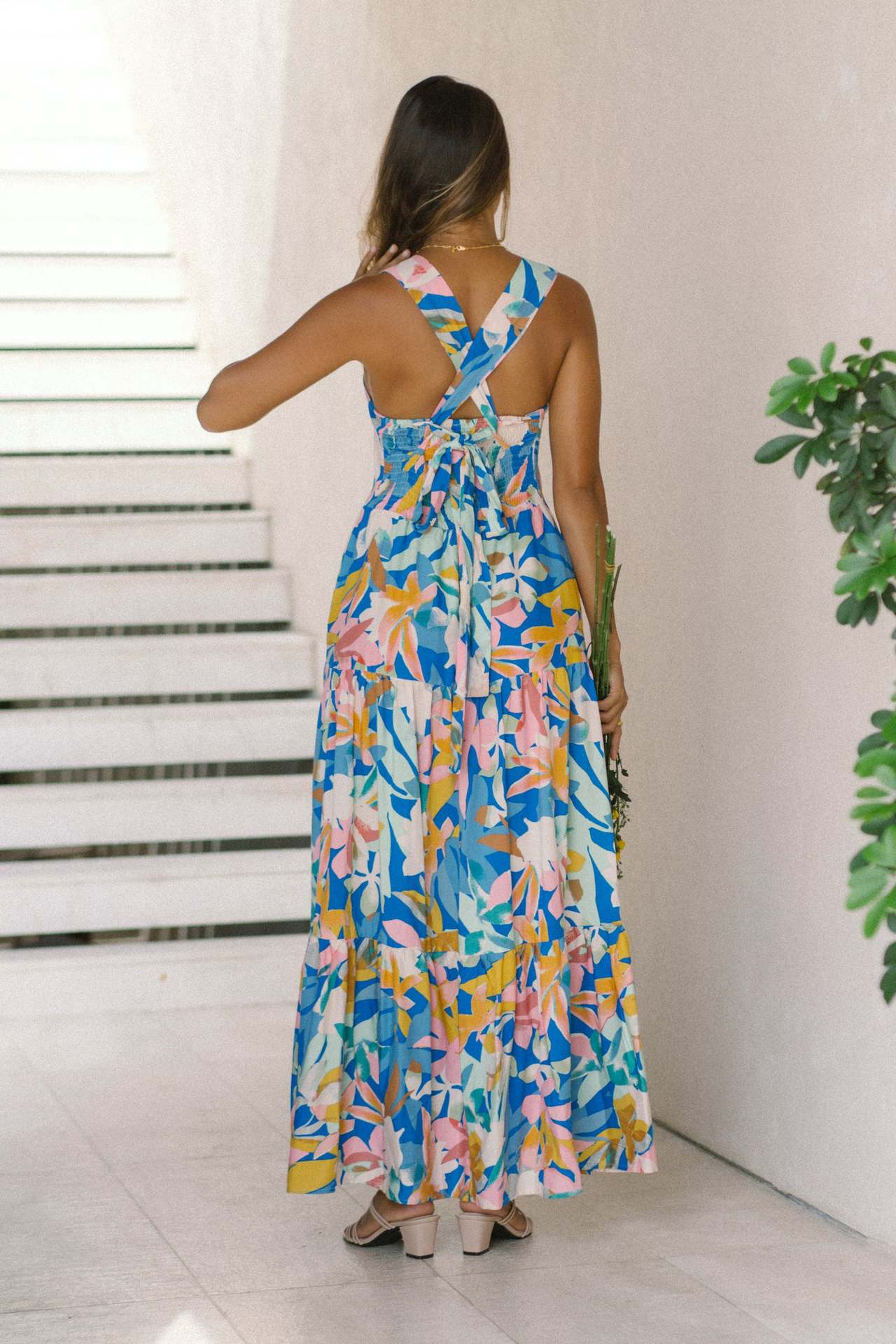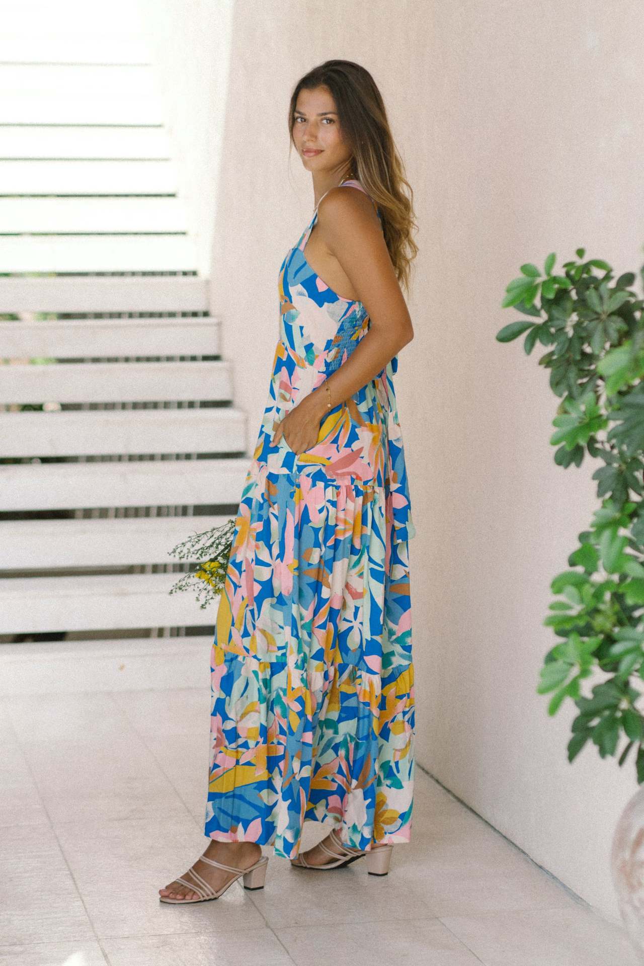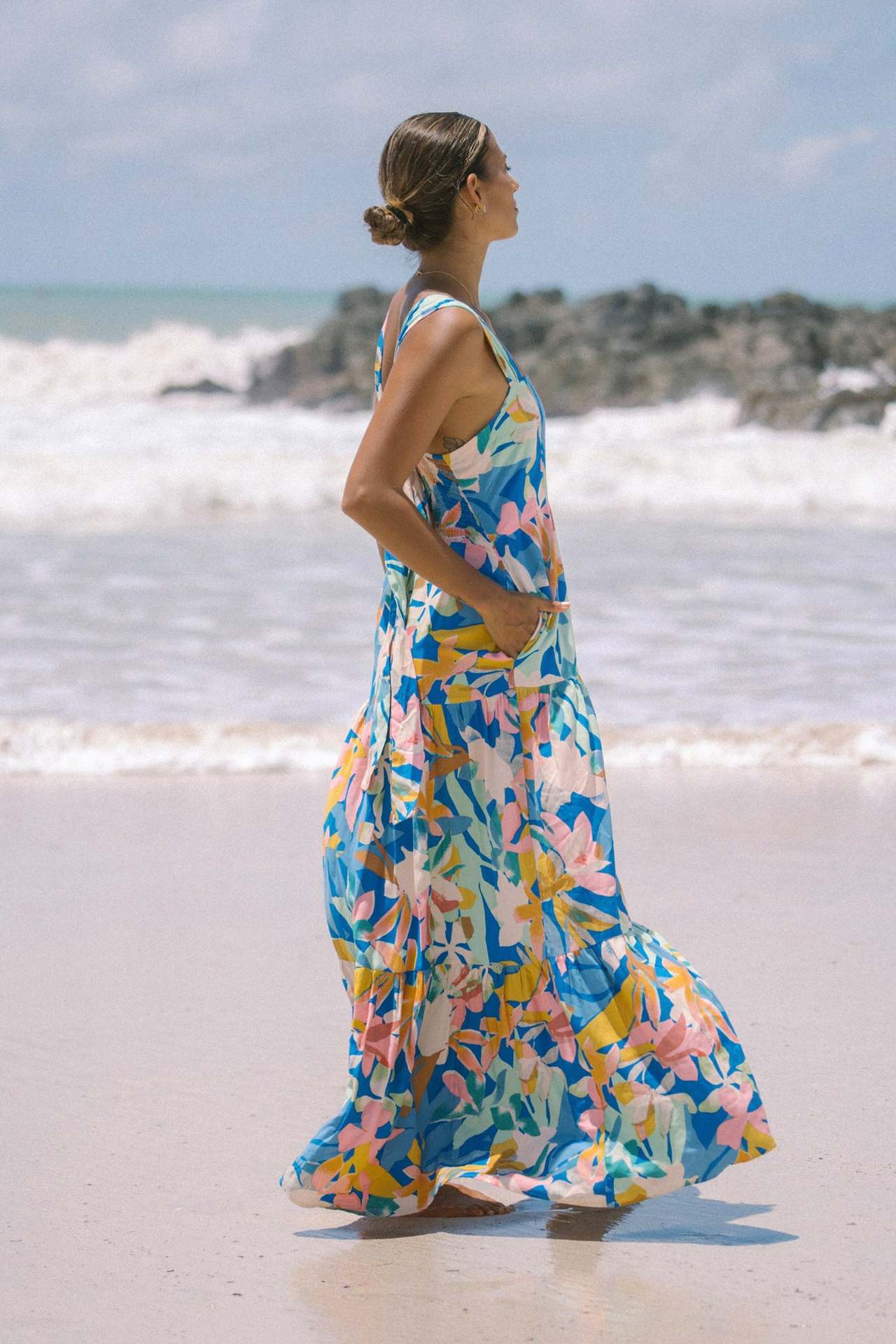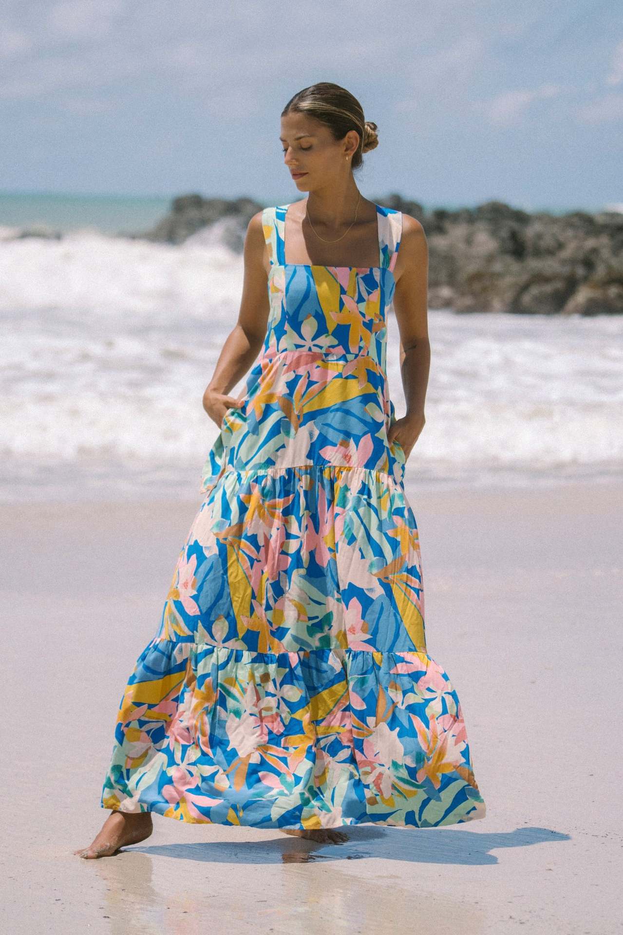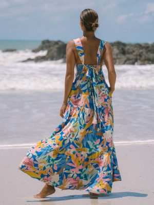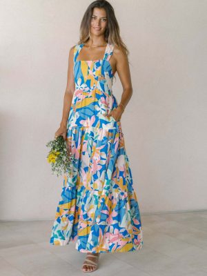 This tropical floral maxi dress features vibrant summer colors, wide straps, and a flowy silhouette that makes it perfect for beach vacations and sunny outdoor occasions.
