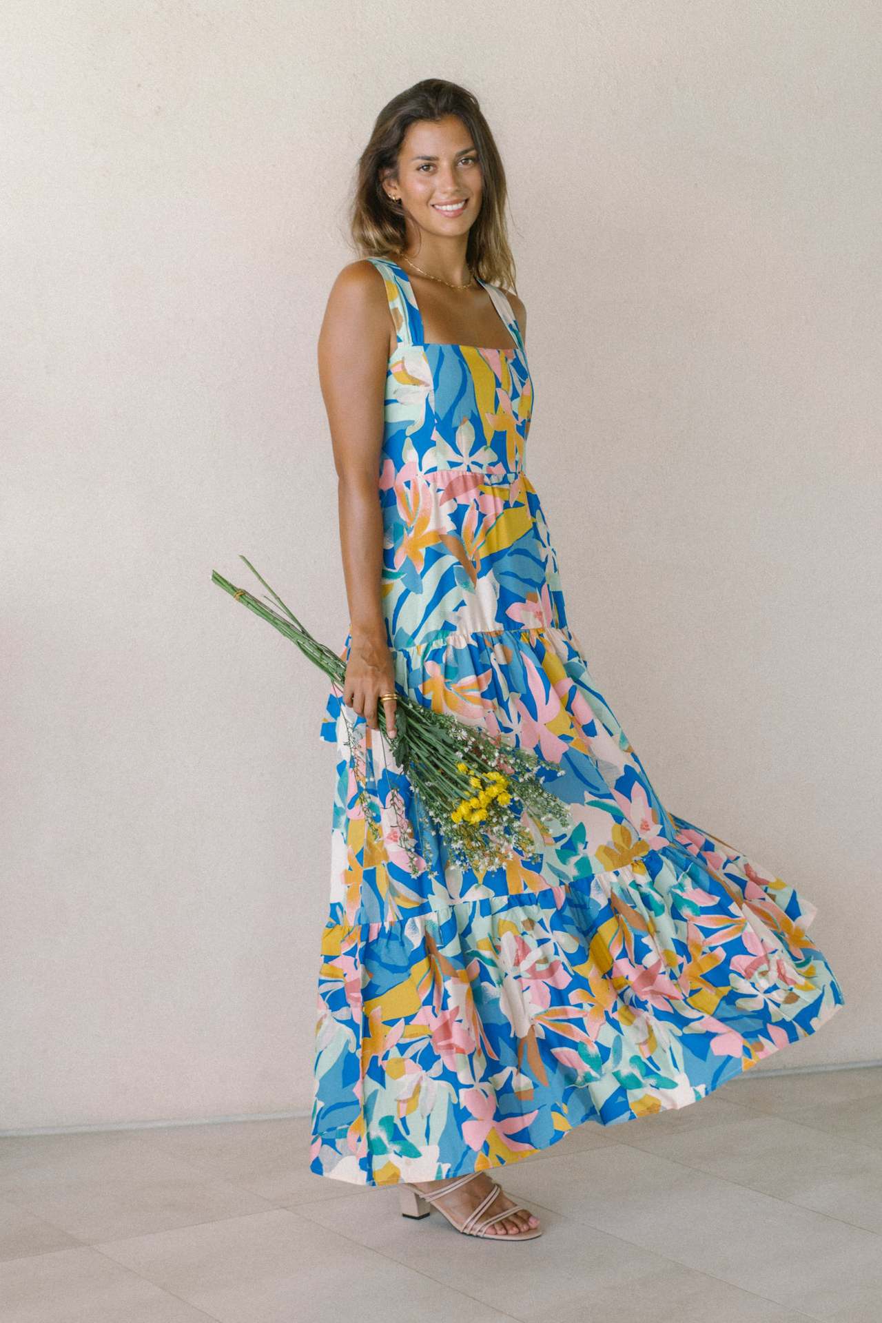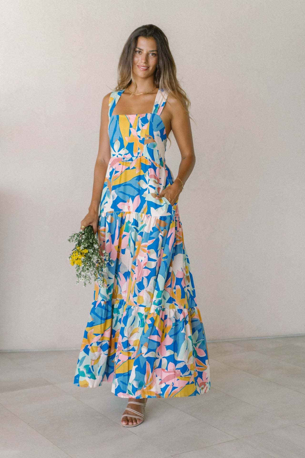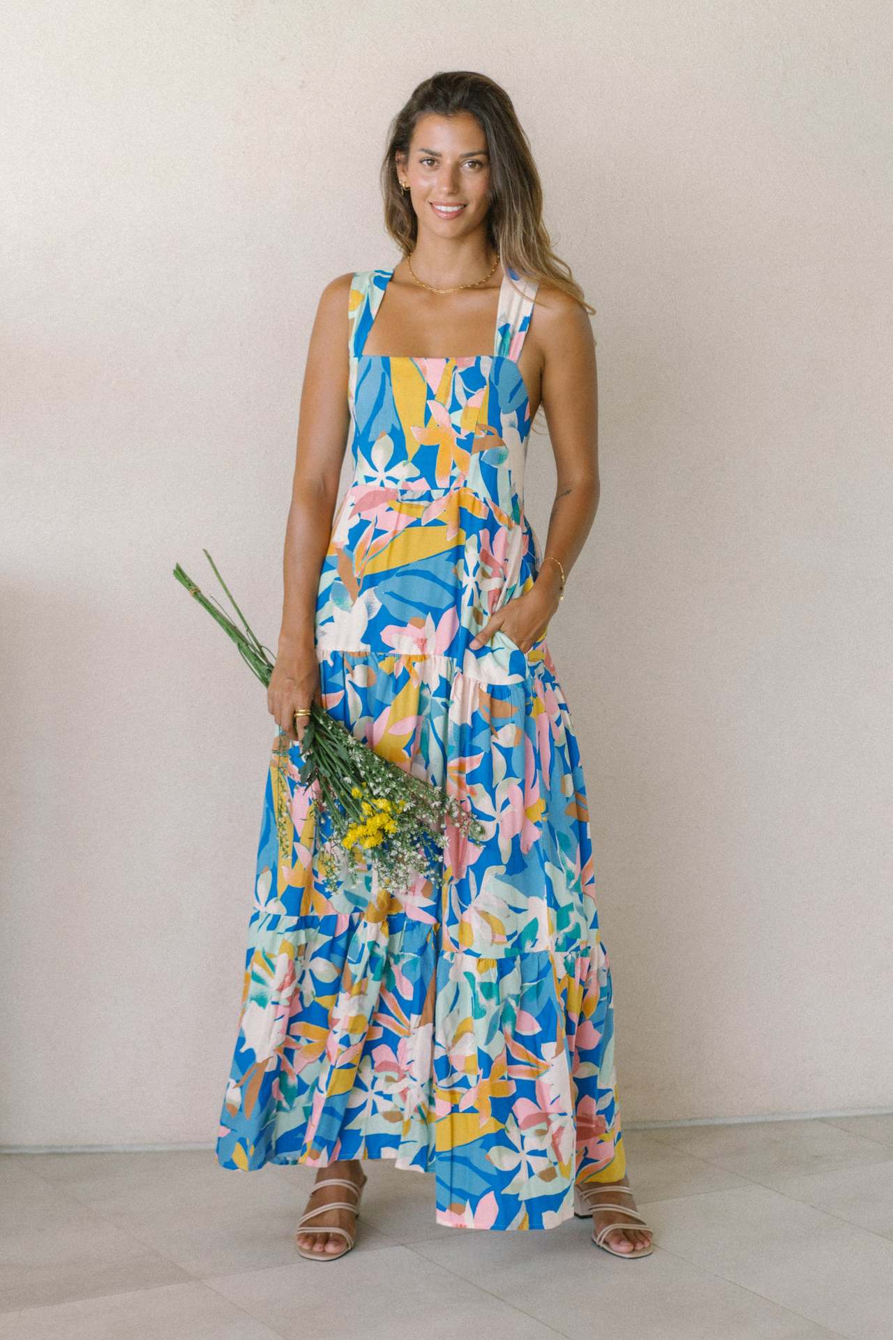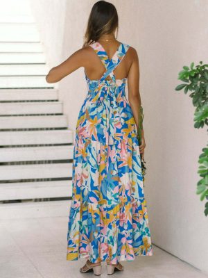 Blue Floral Wide-Strap Maxi Dress – Summer Printed Flowy Dress