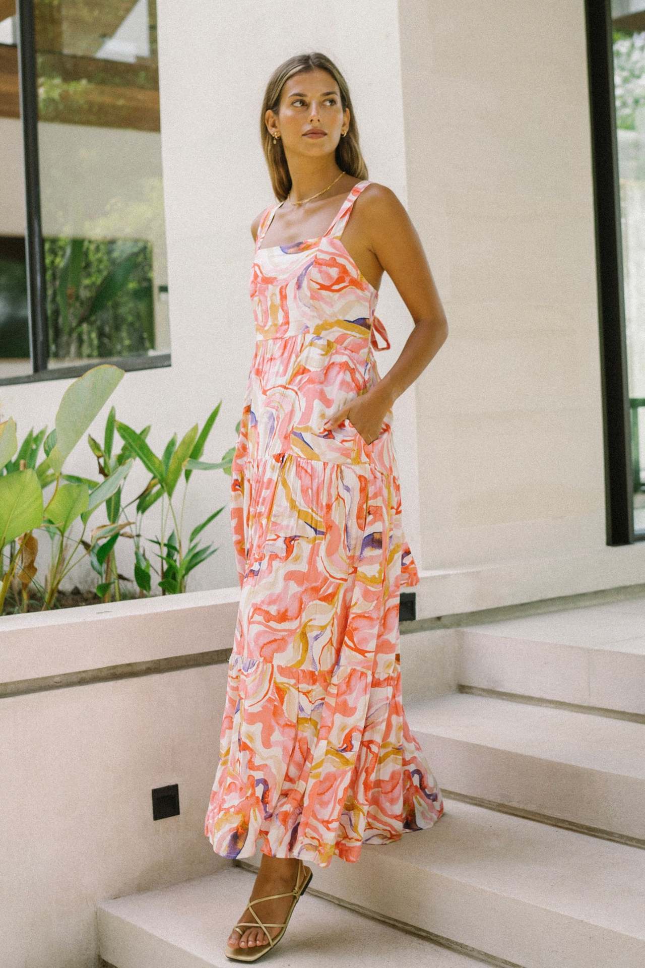 Pink Abstract Wide-Strap Maxi Dress – Vibrant Summer Vacation Style